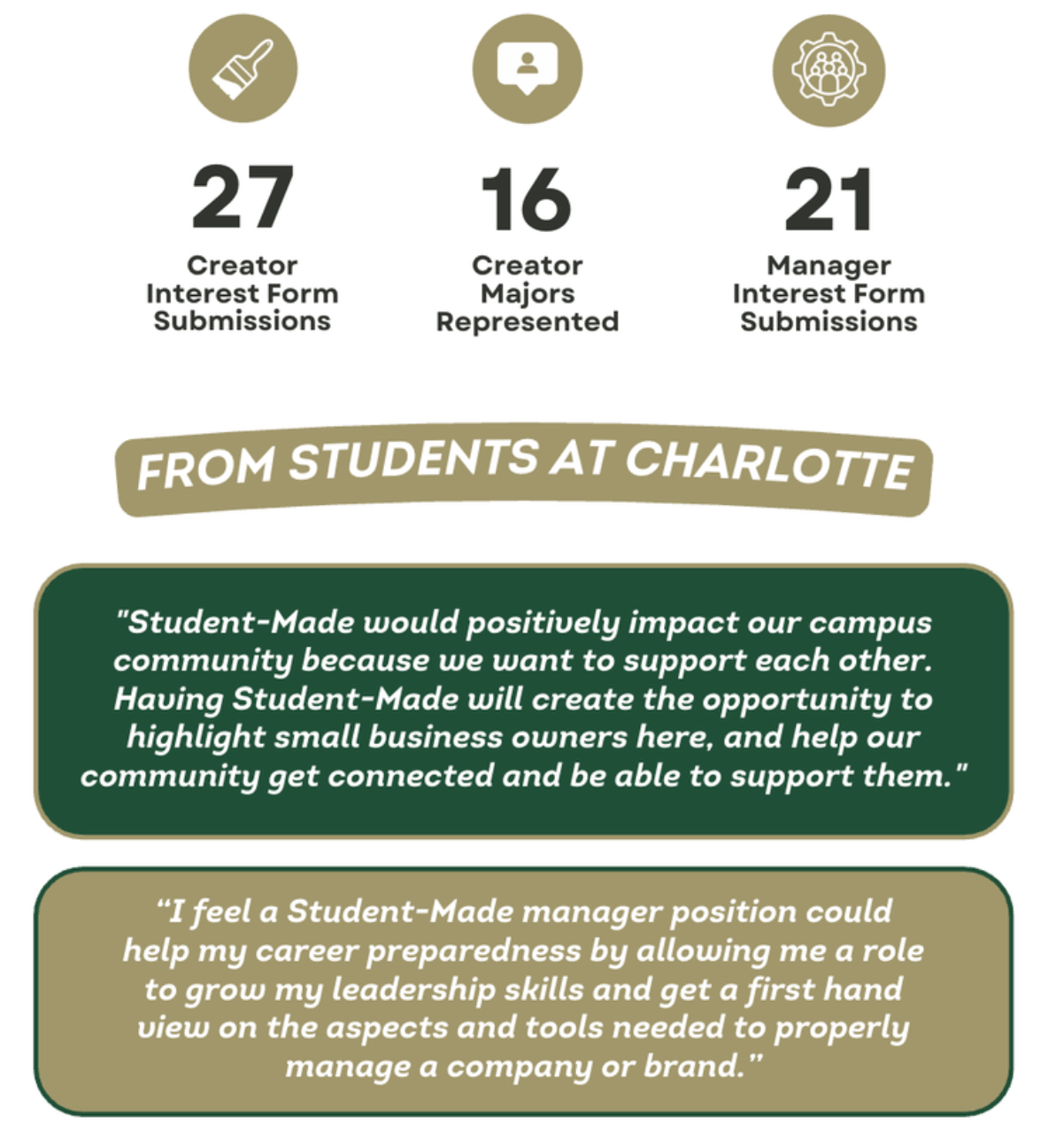 We just finished a study at UNC Charlotte, a school with 32,000 students in Charlotte, NC. We were thrilled to have uncovered a deep passion for creativity and entrepreneurship from students all across campus!